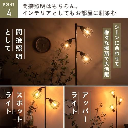 Point 1.【洗練されたデザインの3灯フロアライトで上質なお部屋に】電球を覆う金属格子がランプシェードになっており、マットな質感のスチールで出来た作業灯のようなシェードです。 一般的なスポットライトとは違い対象物を照らすというよりは、光源そのものを楽しむようになっています。 本体はスチール製でマットなメッシュシェードでインテリアのアクセントとしてお使いいただけます。 点灯の際には、メッシュシェードの網目によって光と影が美しく壁に照らし出され、お部屋の雰囲気を一層オシャレに変えてくれます!