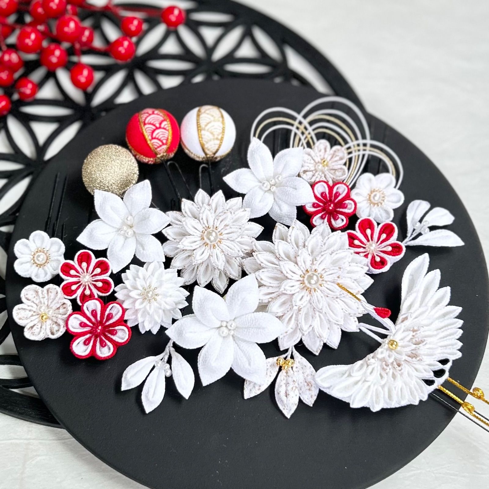 つまみ細工髪飾り 結婚式髪飾り 白無垢髪飾り 打掛髪飾り 色打掛髪飾り 結婚式 白無垢 打掛 打ち掛け 色打掛 ヘアアクセサリー 結婚式ヘアアクセサリー 白無垢ヘアアクセサリー 打掛ヘアアクセサリー 色打掛ヘアアクセサリー かすみ草 カスミソウ タッセル かんざし ちりめんボール フラワー 花 水引紐 箔シート 豪華 華やか 梅 ゆり カサブランカ 髪飾り 花和美