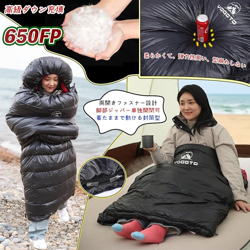 YOGOTO ダウン シュラフ 冬用 寝袋 650 FP コンパクト 車中泊り 登山 封筒型 スリーピングバック 地震対策 防災 避難用 撥水 最低使用温度 -15度 ブラック