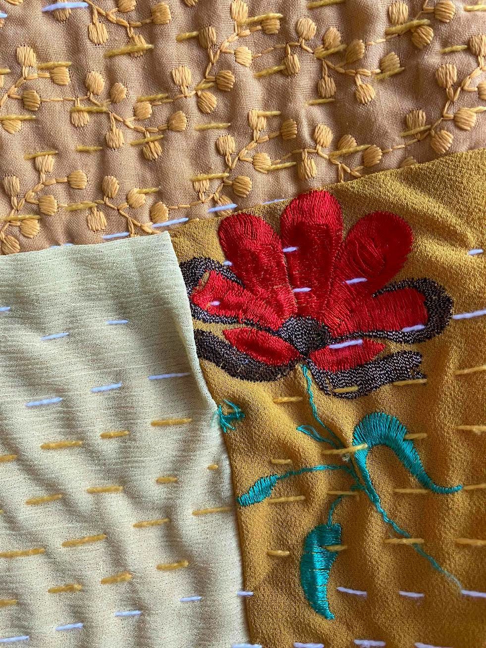 表面生地はインドの伝統衣装のサリーのビンテージ生地を何種類も使用してパッチワークで一枚の布を作っています。裏面生地はしっかりしたコットン生地で、黄色無地です。2枚の生地を重ねてから手刺繍でライン状に丁寧に仕上げています。