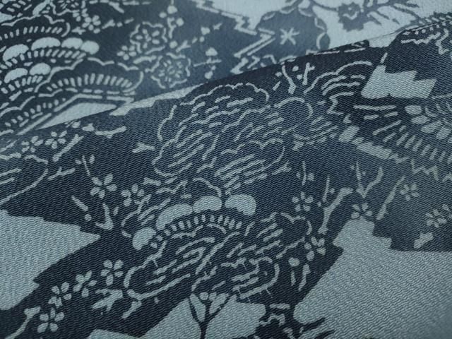 平和屋着物 上質な小紋 流染本藍 型染め 飛鶴松皮菱草花文 鬼しぼ縮緬 反端付き 正絹 ut