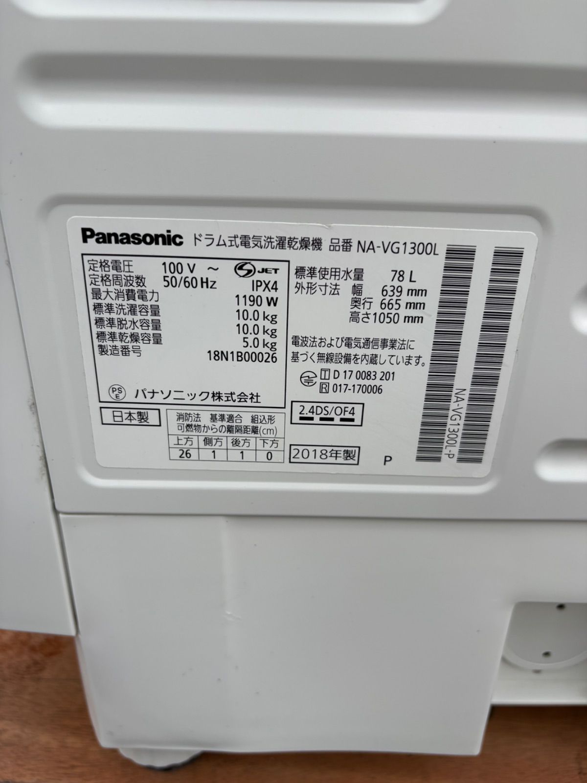 パナソニック ドラム式電気洗濯乾燥機 キューブル NA-VG 1300 L 10 5キロ 2018年製