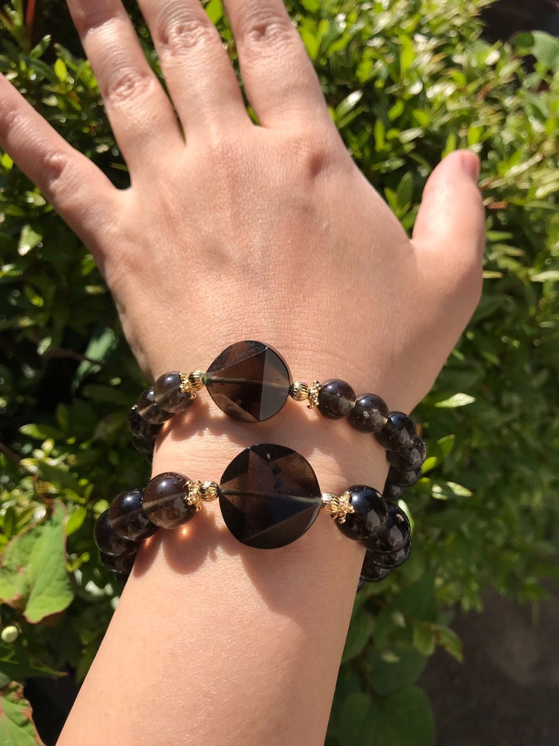 写真最後の2枚は別売りのチンターマニストーン六芒星デザインブレスレット9mm、チンターマニストーン原石&丸珠デザインブレスレットとの比較です。商品はひとつのお値段です。