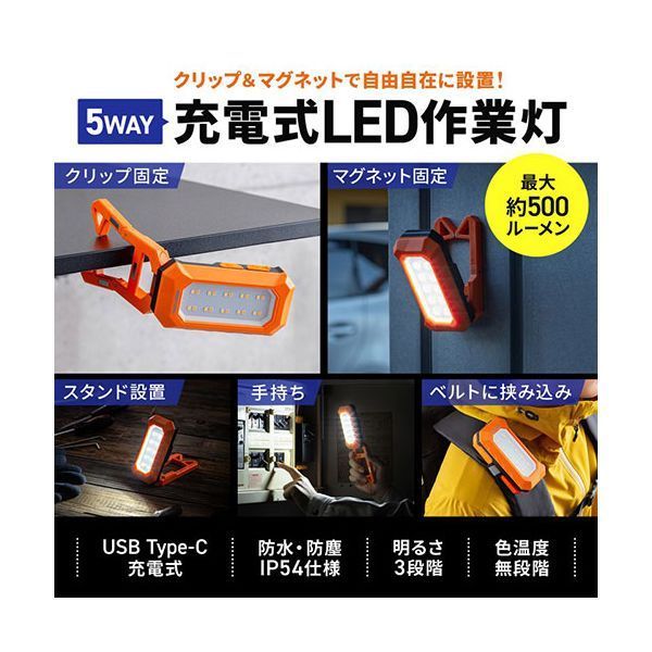 サンワサプライ 充電式 LED作業灯 フック 磁石固定 オレンジ LED-WL 1