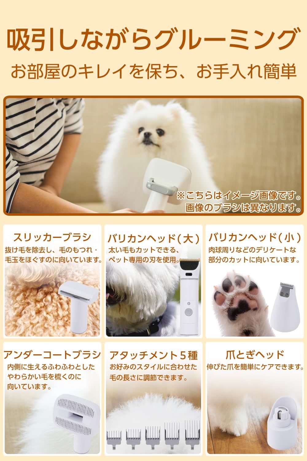 散らばりやすい抜け毛を瞬時に吸引し、お部屋をキレイに保ちながらお手入れが可能。専用のバリカン本体に、バリカンヘッド(大)・バリカンヘッド(小)・爪とぎヘッド、2種類のグルーミングブラシが付属し、バリカンヘッド(大)に装着できる6種類のアタッチメントを付け替えてお好みの長さにカットできるトリミング・グルーミングキットです。