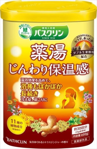 「しっかり温まる薬湯」温浴効果を高めて、冷えた身体を温めて、湯冷めしにくく、冷え症、肩こりに効果的です。ダブル生薬kりゅう<新配合>生薬研究により選定した「センキュウ」と「トウキ」。温泉ミネラルの粒に閉じ込めた2種類の生薬末が、お風呂の中に広がり、温浴効果を高めます。11種の植物成分(保湿成分)をセレクトし配合しました。気分ほぐれるシトラスジンジャーの香り。和漢イエローの湯色。約30回分