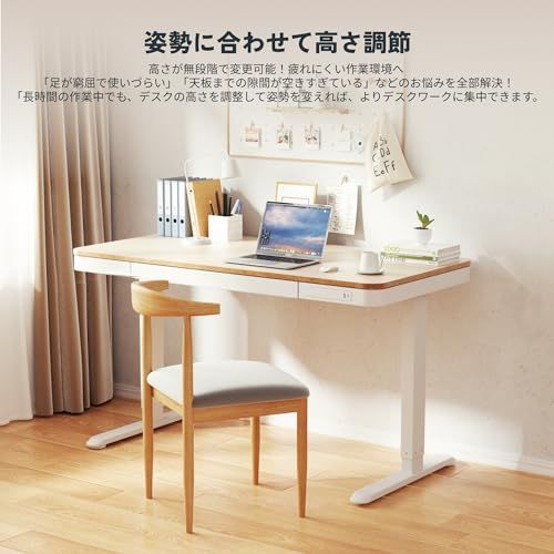 商品規格:天板サイズ:120.4*60.4cm 昇降範囲:73.5-118cm 昇降速度:20mm/s 耐荷重:50KG。木製天板をスチールのフレームと組み合わせ、暖かみのある原木系の色がデザインの美しさを引き立てる。一人暮らしや在宅ワークの間に、このデスクは心に安らぎをもたらし、仕事から集中力のリフレッシュを提供するでしょう。※クランプ式のモニターアームやキーボードトレイなどのご利用はできませんので、予めご注意ください。