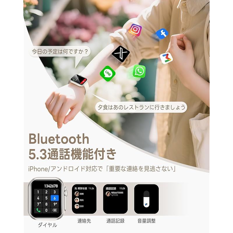 【最新Bluetooth5.3通話機能&メッセージ通知対応】本スマートウォッチは最先端のBluetooth5.3技術を採用し、接続の安定性と通話の音質が大幅に向上しました。スマートウォッチに連絡先を保存したり、発信・受信、過去10件の通話履歴確認、通話中の音量調整も可能です。内蔵のスピーカーとマイクにより、屋外でも快適に通話できます。さらに、「FitCloudPro」アプリと連携することで、LINE、Twitter、Instagram、Facebookなどのアプリ通知をリアルタイムで受信でき、運転中や家事中でも大切なメッセージや電話を見逃しません。日常やビジネスシーンでも高い利便性を発揮します。