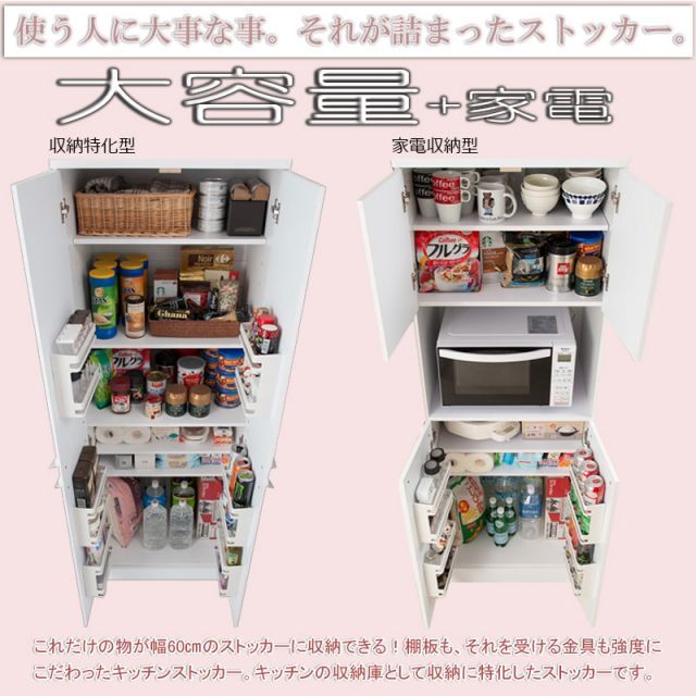 ■商品について/人気のキッチンストッカーに、レンジなど収納もできる家電収納型キッチンストッカーが登場。キッチン廻りの必需品を、大量にストック。ごちゃごちゃした物は板扉のストッカーで綺麗に隠す。しかもシンプルで取り出しやすいので詰め込んでも安心。扉内の付属収納ポケットは取り外し可能なので、好みで取付可能。扉はそれぞれ独立して開閉するので使い勝手も◎。乾物や食品ストック、お米、缶ビールやペットボトルの大量ストックなどこれだけのアイテムが収納できるキッチンストッカーは重宝します。品質にもこだわり、棚板を支える金具は抜け落ちにくいネジ式ダボを採用。頑丈な取っ手はタオルやキッチンツールを掛ける事もできます。前板には傷や水に強いハイグロスシートを使い、それ以外もプリント紙に樹脂コート加工をして傷や劣化強度をあげています。