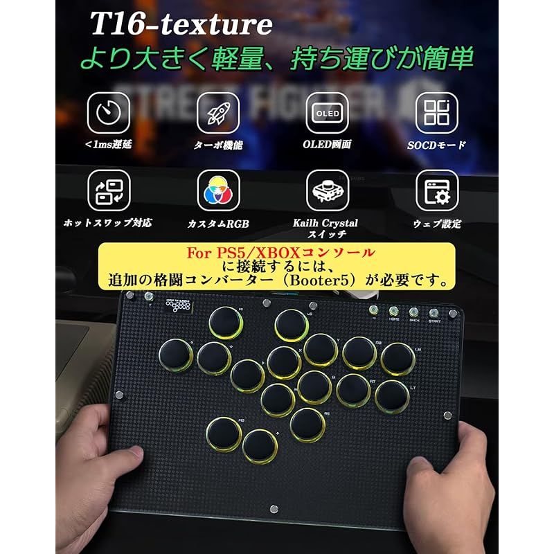 「多機種対応」 For Windows 10以降、Steam Deck、PS3、PC、PS4、Switch、Steamなどに対応。??PS5やXBOXに接続する際は、専用の格ゲーコンバーター(Booter5コンバーター)が必須。弊社では、PS4/PS5に対応したBooter5コンバーターと、XBOX用のFGCを提供中。