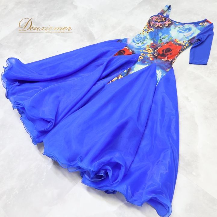 社交ダンス 衣装 ドレス ワンピース 青 花柄 パーティ 伸縮 光沢 サテン 軽い ブルー系 発表会 花 青色 パーティドレス おしゃれ 発表会用 お洒落 フォーマル 上品 発表会衣装 魅力的