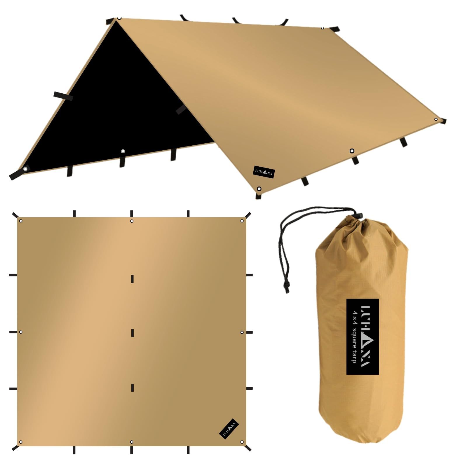 LUHANA タープ 正方形 スクエア 難燃性 ポリエステル 耐水圧8000mm ブラックコーティング シルバーコーティング ループ19個 軽量 4mx4m / 3.5mx3.5m / 3mx3m / 4mx3m (サンドベージュ(難燃性ブラックコーティング ), 3.5mx3.5m)