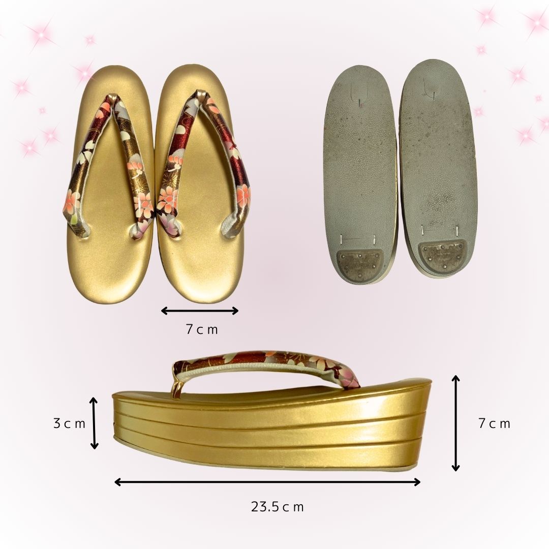 コ゚-ルドべ-スに、赤やラメや花が散りばめられている、素敵な草履バッグセットです。