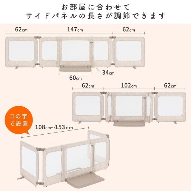 ・置きたい場所に合わせて形を変えられます。・伸ばしたりコの字にしたり、場所に合わせて形が変わります。・おくだけなので設置がカンタンです。・自立型ベビーゲートなので持ち運びができて家じゅうで使えます。(※階段上は使用不可。)・幅が広く、両端のパネルの角度を調節できるので使い方や設置場所の幅が広がります。・ベビーゲートとしてだけでなく、キッズスペースやイタズラ防止などいろいろな使い方をしていただけます。・お子様がセーフティプレートに乗ることで、本人の体重がかかり倒れ込みません。また、躓きにくい設計になっています。・サイドスタンドやスタンドフレームで倒れにくいようになっており、安心してお使いいただけます。・間口に合わせてサイドパネルが伸縮します。
