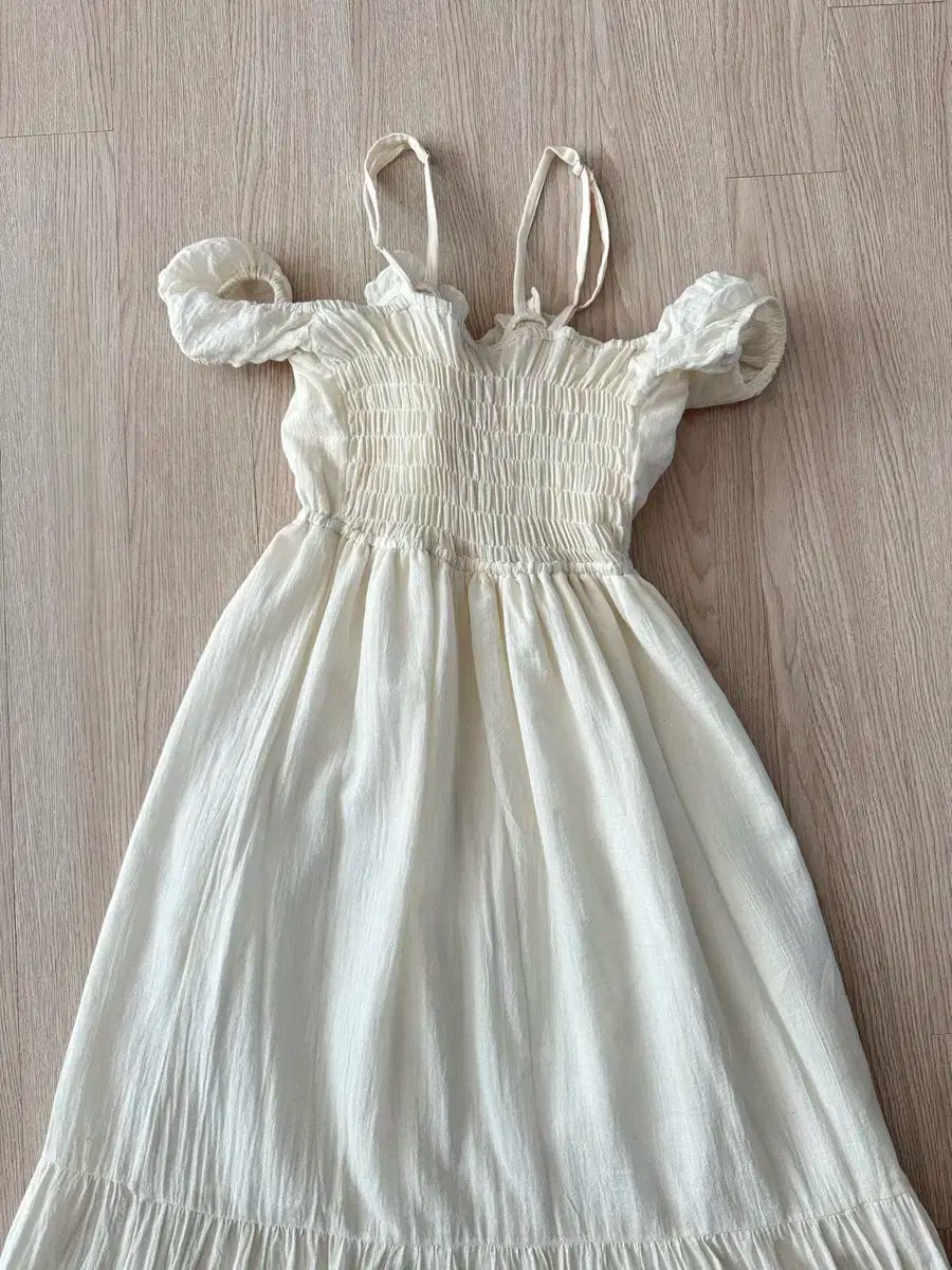 オフショルダーとしても、肩のフリルを内側に入れてストラップドレスとしても演出可能です。