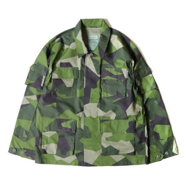 1981年に正式採用され現代もミリタリーウェアの代表格であるBattleDressUniform通称「B.D.U.ジャケット」フロント部分に上下2つのポケットに加え、左右の袖にもポケットが付いた定番のスタイルに仕上げました。独特のパターンで人気のあるスウェーデン軍M90グリーンカモフラージュで仕上げています。グリーンは森林のイメージを表現し、直線的なデザインは、国境を表現しているといわれています。スウェーデン軍独特なカモーフラージュです。サイズ表示は海外規格です。実寸を必ずお確かめのうえ御買い上げ下さい。