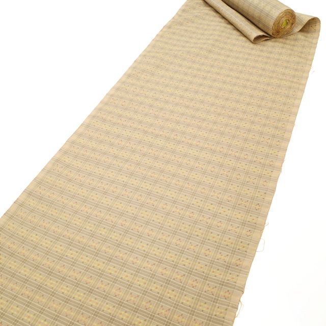 こちらのお品は、優しい薄茶ベージュをベースに、濃淡のある格子柄と花織模様が美しく組み合わされた一反。