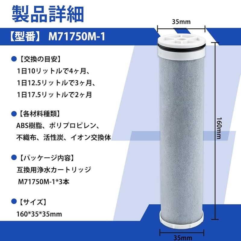 【型番】: M71750M-1 交換用浄水カートリッジ(3個入) 浄水能力:遊離残留塩素、CAT(農薬)、2-MIB(かび臭)、溶解性鉛、クロロホルム、ブロモジクロロメタン、ジブロモクロロメタン、ブロモホルム、テトラクロロエチレンなど。