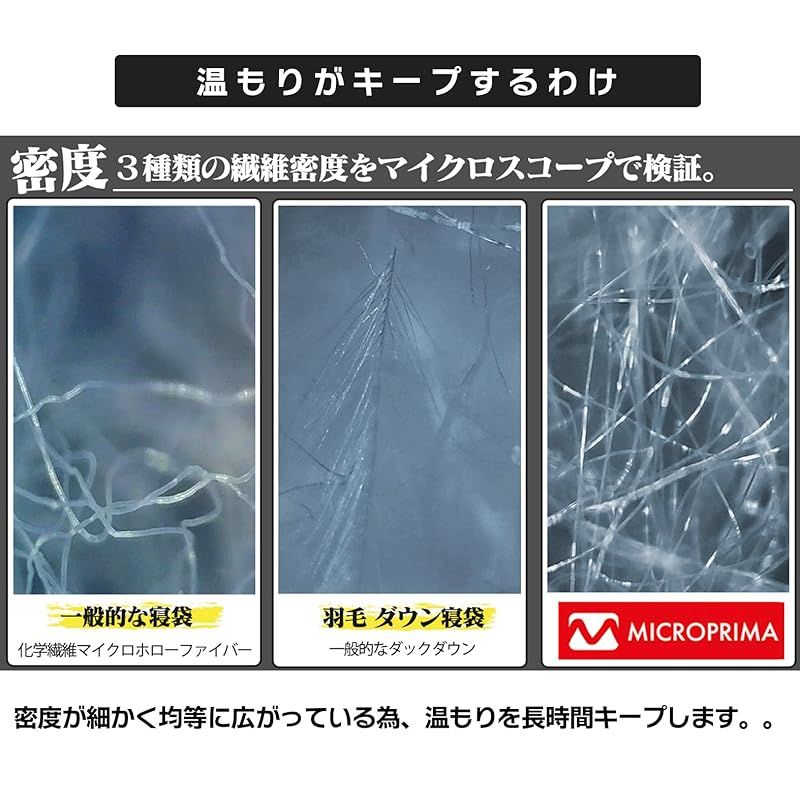 人工ダウンは超微細のマイクロファイバー構造が寝袋内部にしっかりと空気の層を作るのでぬくもりを逃さず暖かくお使いいただけます。
