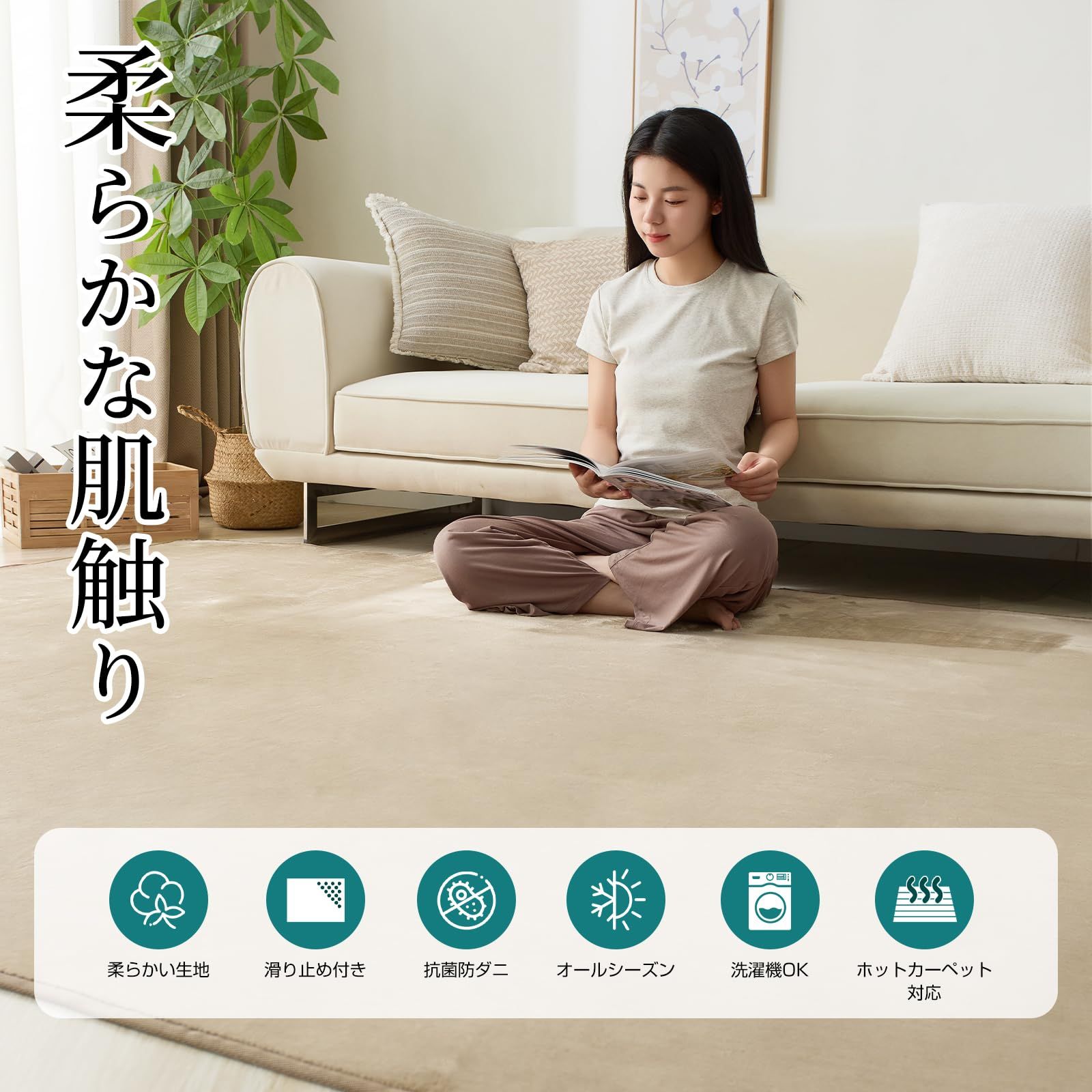 【抗菌防臭・安全安心】ラグには抗菌・防臭・防ダニ加工が施されており、清潔な状態を長く保ちます。小さなお子様やペットがいるご家庭でも安心してご利用いただけます。アレルギーが気になる方も安心してご利用いただけます。
