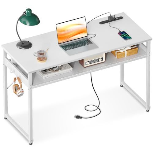 ODK 机 pcデスク パソコンデスク 幅100cm ゲーミングデスク 収納付き コンセント付き 勉強机 computer desk 子 ワークデスク フック2個付き コンパクト テレワーク用 省スペース 組立簡単 白い