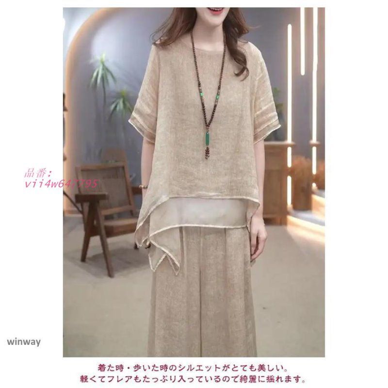 赤字覚悟!綿麻 セットアップ 秋 体型カバー きれいめ レディース ゆったり カジ 2点セット 韓国 柔らか 春 半袖 大きいサイズ 上下セット ロングパンツ