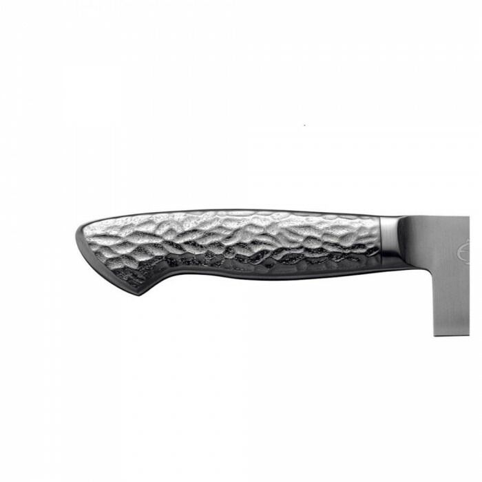 刃物の命ともいえる刃研ぎは、受け継がれてきた伝統技法による手仕事。職人が長年の経験を元に時間をかけてじっくり研ぎ上げ、鮮烈な切れ味を生み出しています。ハンドルは、気品ある槌目模様、深みある銀の色調。変則的な打痕が美しい陰影を生み出す印象的なデザインです。槌目の上に滑りにくい加工を施し、手に吸い付くような感覚と握りやすさを実現。さらに中を空洞にしたモナカ柄にする事で長時間使っても疲れにくい構造です。