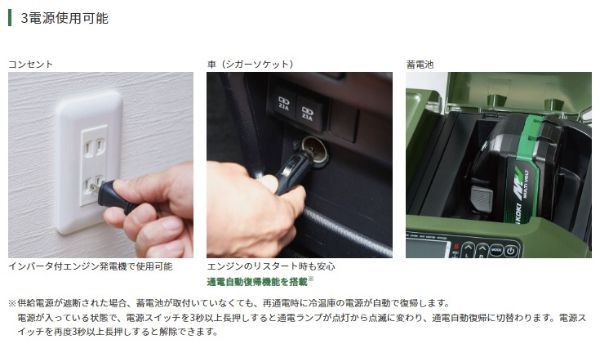 ・3電源使用可能:コンセント、車(シガーソケット)、蓄電池