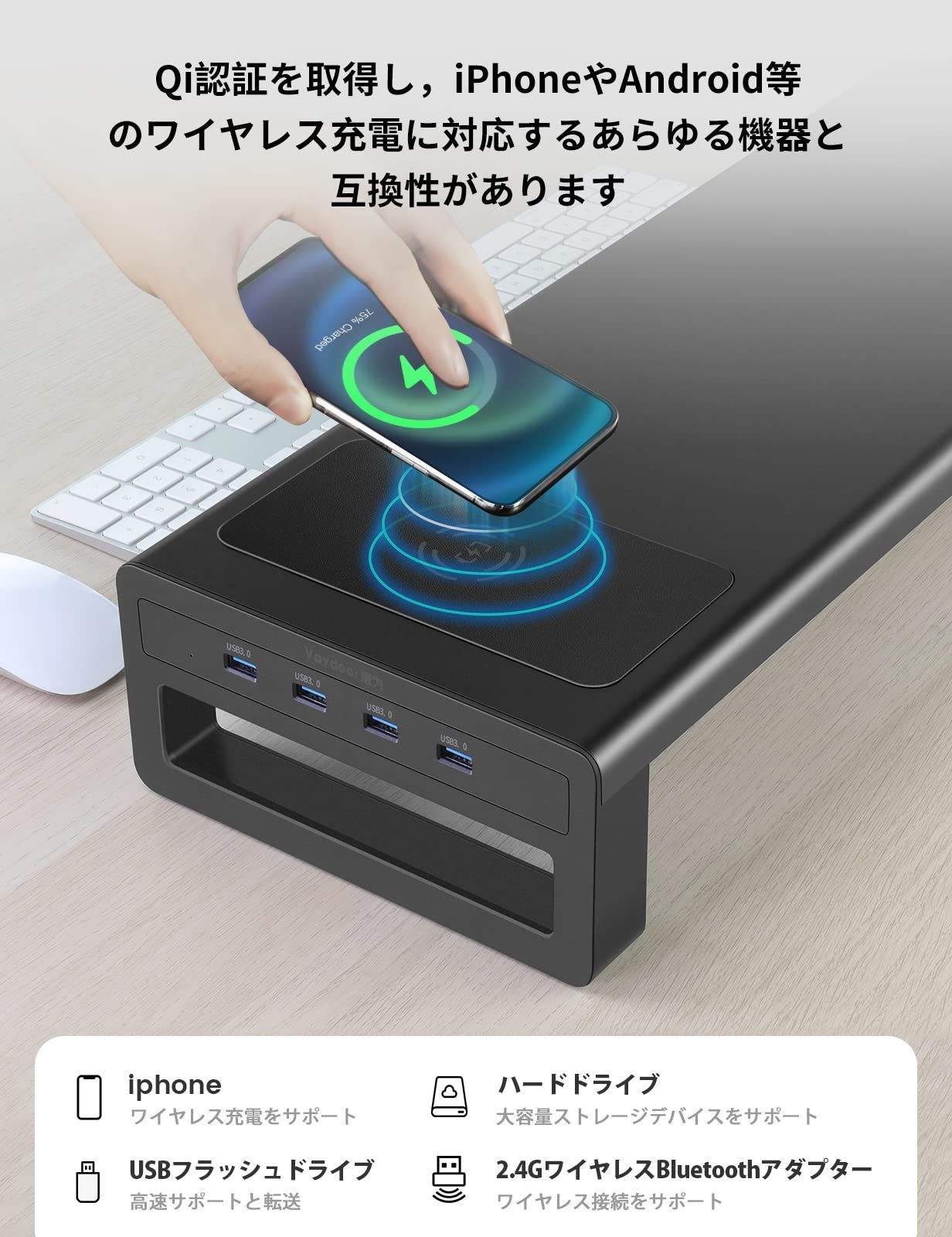 数量 モニター台 USB VAYDEER 3.0 ディスプレイ スタンド ワイヤレス充電機能 パソコン 机上台 卓上 高速データ転送 キーボード収納 プリンタ 金属製 ブラック 幅54 cm