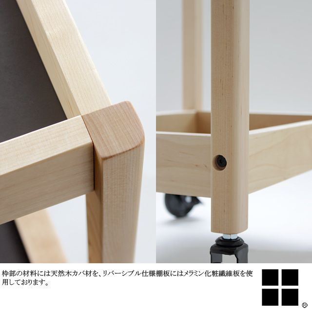 枠部の材料には天然木カバ材を、リバーシブル仕様棚板にはメラミン化粧繊維板を使用しております。