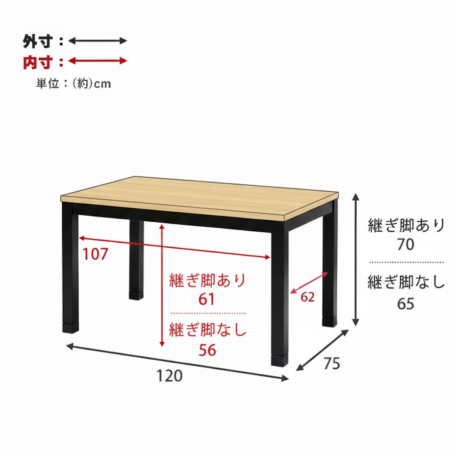 布団レス設計: こたつ布団をかけずに使用できるヒーターを搭載。わずらわしさを解消しました。