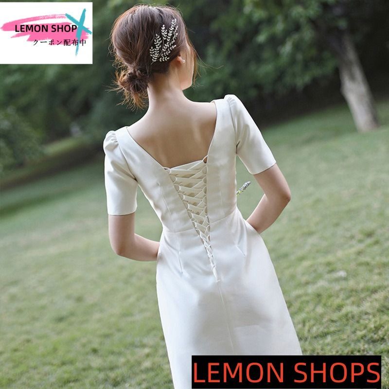 2025 ウエディングドレス 二次会 花嫁 前撮り ウェディングドレス 半袖 ロングドレス タイト 結婚式 エレガント 白 シンプル リゾート ワンピース 韓国風 LEMON
