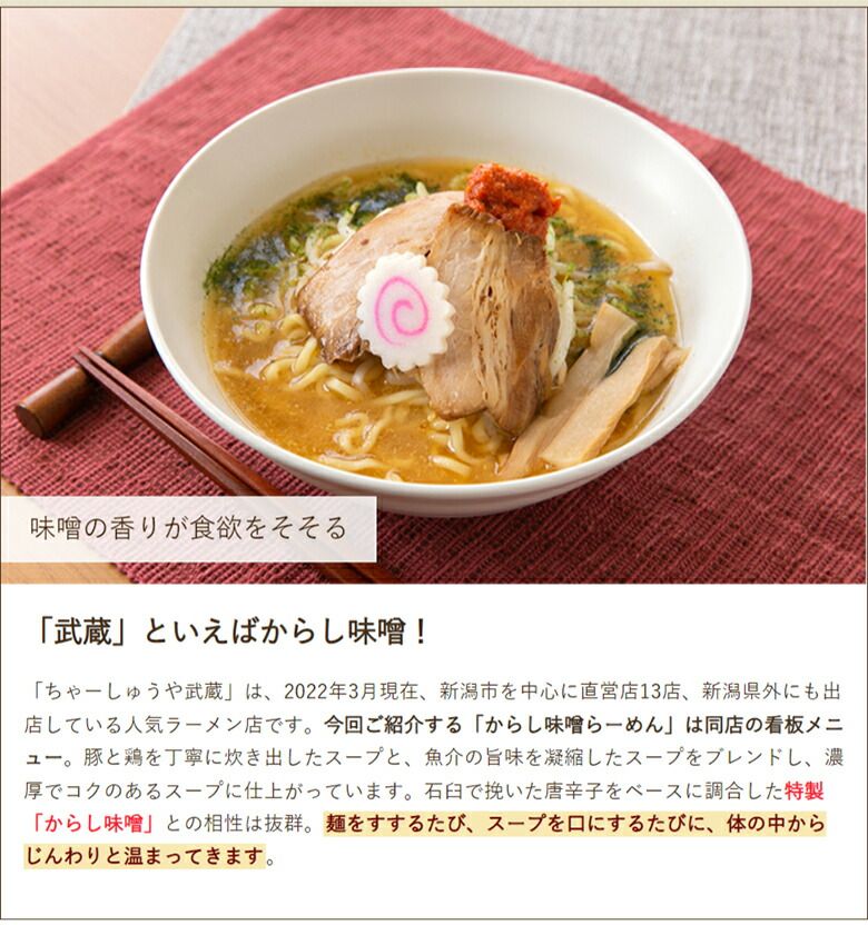 動物系と魚介系のスープをブレンドしたダブルスープに、特製のからし味噌がベストマッチ。心も体も温まる一杯です。こだわりのチャーシューはモンドセレクション金賞を受賞。ぜひご自宅で味わってください。
