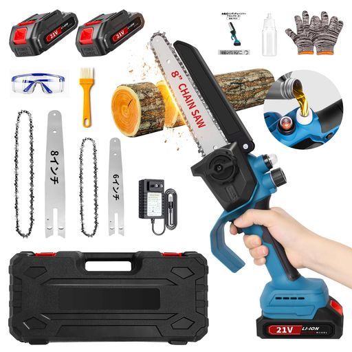 【8インチ・6インチチェーンソー・耐久性に優れ】ハンディチェーンソーは改良版のブラシレスモーターと鋭い高硬度ソーチェーンを採用して、最大回転速度は5200r/minと高く、チェーンスピードは9m/sで、直径15cmの木材を6秒以内に切断できます。切断効率が大幅に向上します。