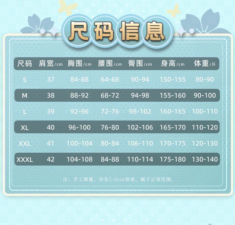 3XLサイズ:肩幅 42cm / バスト 104-108cm / ウエスト 84-88cm / ヒップ 110-114cm / 身長 175-180cm / 体重 130-140斤
