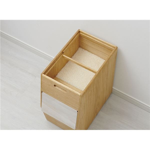 片手で簡単に開閉できるフラップ式扉採用。上部からお米を補充し前面下からお米を取るので古いお米がたまりにくい構造になってます。桐製の1合升付き。移動が楽な後部キャスター付き。