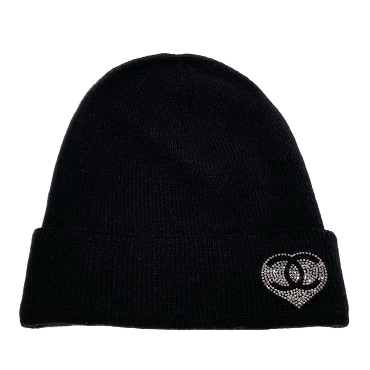 CHANEL シャネル ニット帽 - 黒 ココマーク ラインストーン ハート カシミヤ