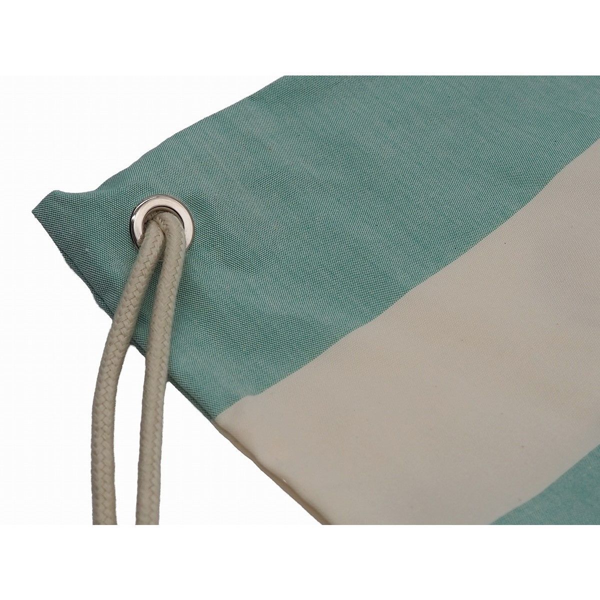ティファニーブルーのストライプが目を惹く薄手の素材で、タオルやブランケット、テーブルクロスとして使用したり、ソファーにかけてお部屋のアクセントにもピッタリです。ナップサックは軽量で可愛くカジュアルにお使いいただけるアイテムでございます。