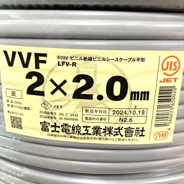 富士電線 VVFケーブル 2×2.0mm 灰色 100m 黒白