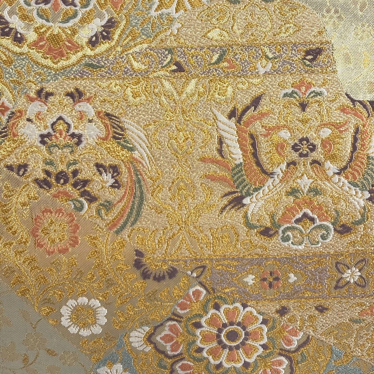 袋帯 秀品 全通箔 華文 向かい鳥 箔 唐織 金色 六通 正絹