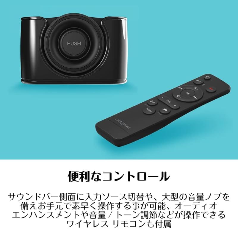 スリム&ロープロファイルなボディにカスタムチューンを施した楕円ドライバーを搭載、ピーク出力48Wのパワフル サウンドと、大型バスラジエーターとバスレフ ポートによる豊かな低音を実現。Sound Blasterオーディオ処理技術によるオーディオ エンハンスメントも備え、音量/トーン コントロールやエンハンスメントを切り替え可能なワイヤレス リモコンも付属。