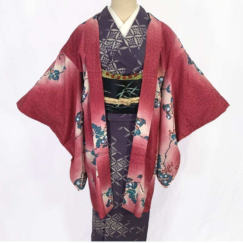 深い苺色に山葡萄が唐草文とともに入ったアンティークの羽織です。羽織紐、中に着付けている着物、帯、小物は参考商品です。