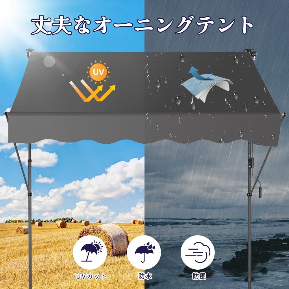 丈夫で頑丈なオーニング:当社のつっぱり防水シートは、アルミニウム製ローラーとグレー塗装仕上げの頑丈なスチールフレームを使用し、接続部分はネジで固定されているため、耐久性と安定性に優れています。100%ポリエステル生地に高級防水コーティングを施したパティオキャノピーは、UV80+のサンプロテクションを提供します。ベランダ目隠しは、さまざまな天候で風、雨、日差しを防ぎます