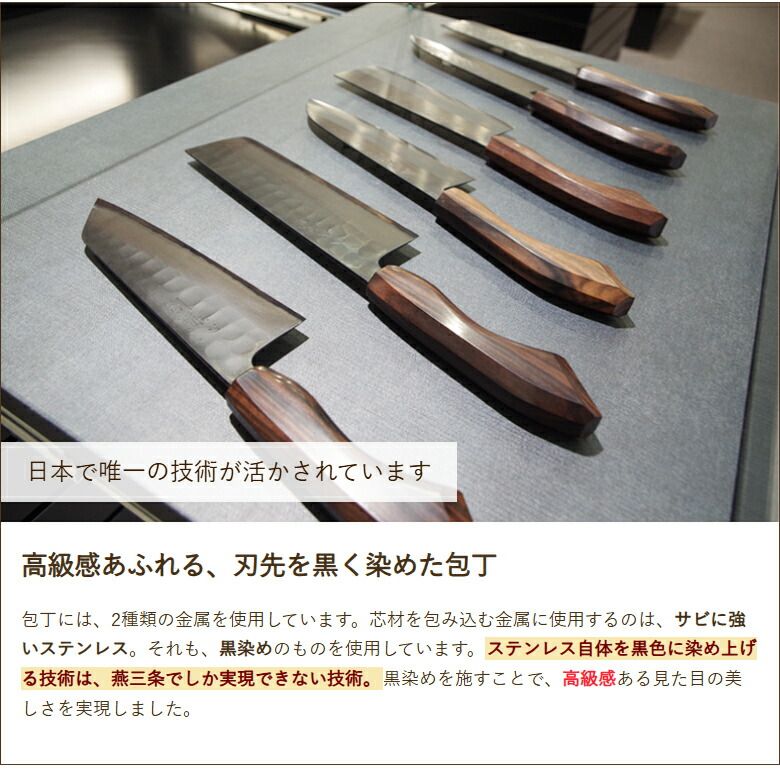 燕三条が誇る金属加工技術や木工技術を集結した、高級三徳包丁です。特殊な技術で黒く染まった刃先は、高級感が溢れます。柄の素材や形状にもこだわり、見た目、使い勝手、切れ味のすべてを追求しました。