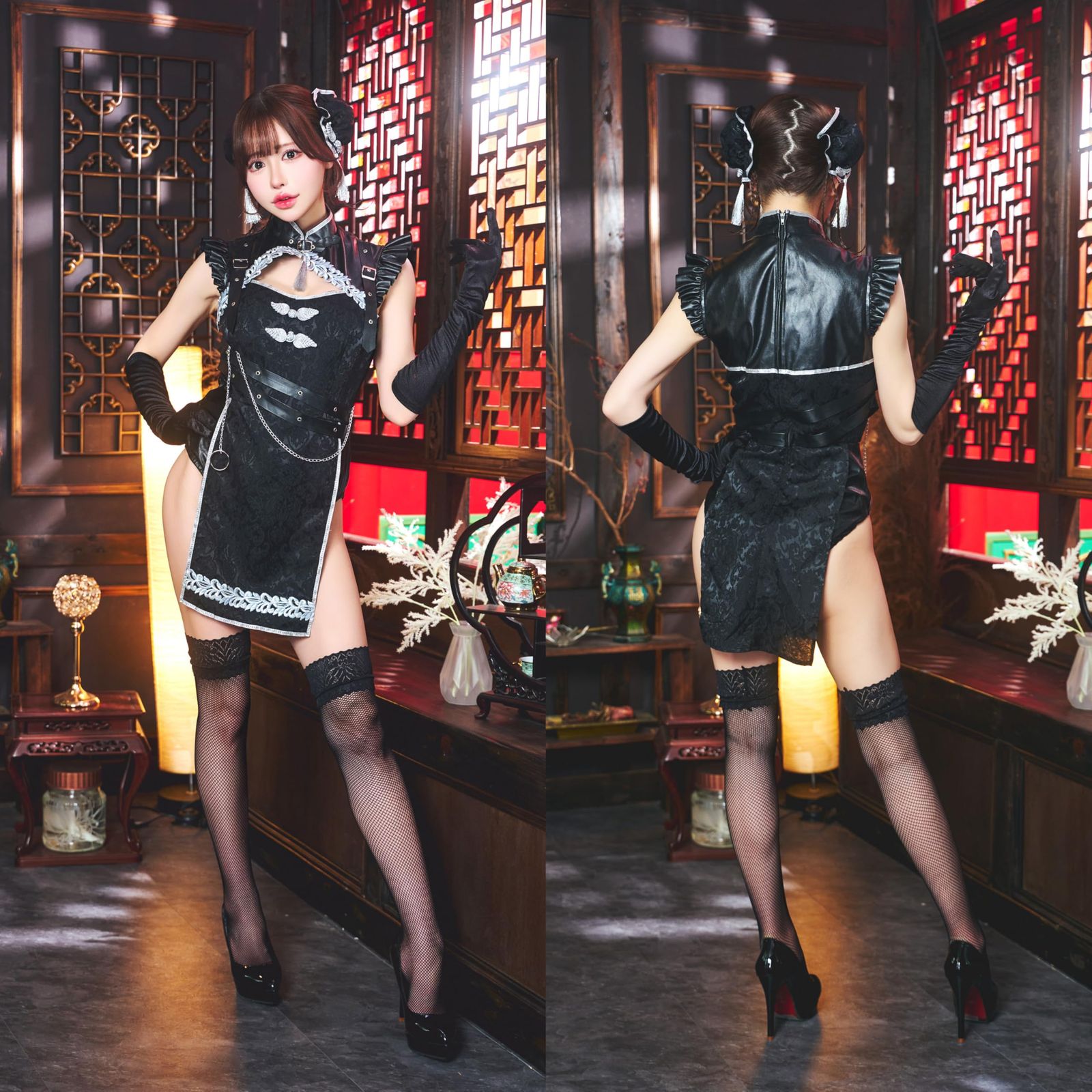 漆黒のジャガード生地に合皮のベルトを重ねたデザインが、クールでエッジの効いた印象を演出するチャイナドレスです。