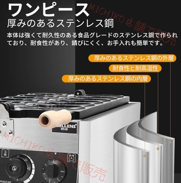 商品の説明商品の説明この業務用ホットサンドワッフルメーカーは、のどかな日本の風景を思わせるデザインの鯛焼き器です。金魚がモチーフで、一度に6匹の小さな金魚を焼くことができます。電動式で操作も簡単で、食材を挟んで焼くだけで、おいしい鯛焼きを楽しめます。鯛焼き器としてだけでなく、ホットサンドワッフルとしても利用できるので、メニューのバリエーションが広がります。これは、お店や家庭で使うのに最適な鯛焼き器です。
