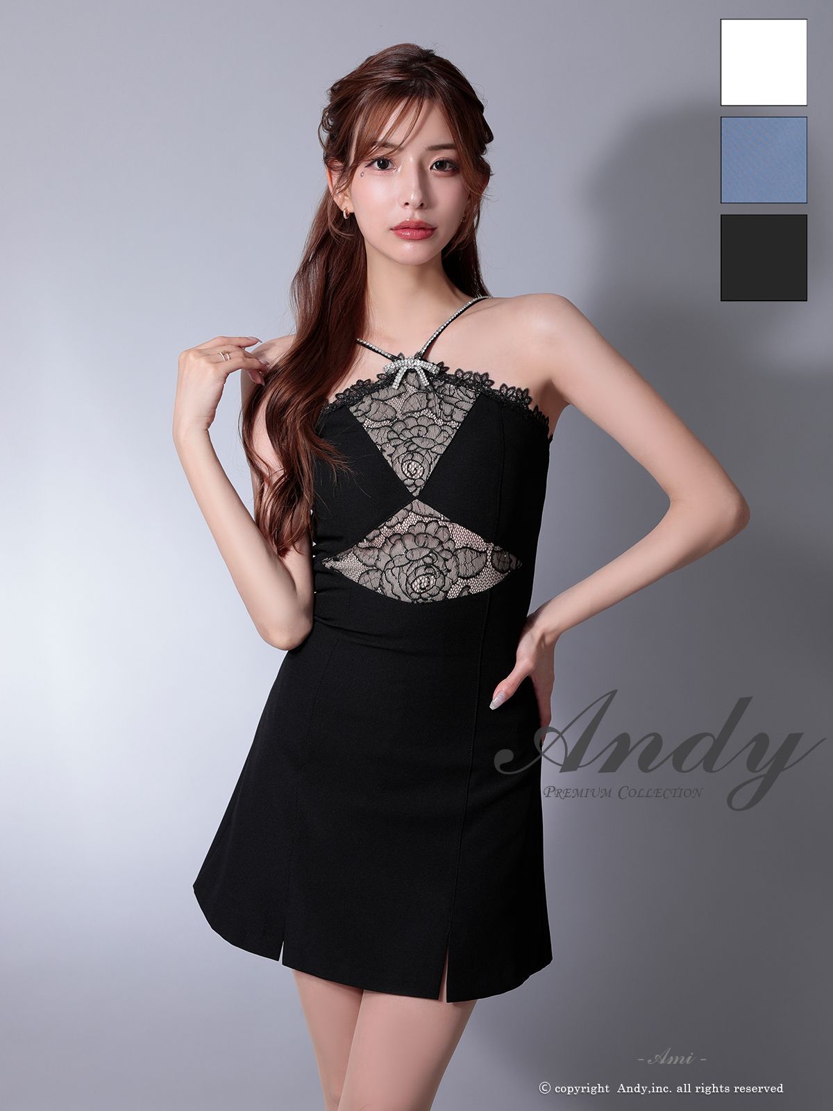 ブラックS OK 2961-W-2507 XSサイズあり ANDY アンディ ビジューリボン ホルターネック レース 切替 ストレッチ フ ミニドレス キャバドレス