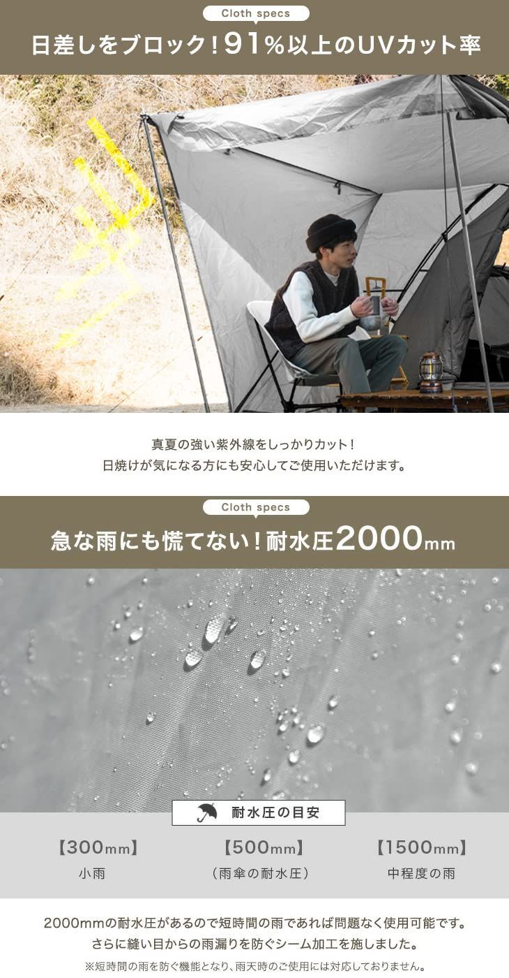 【材質】インナーテント・フライシート:190Tポリエステルタフタ (裏面:PUコーティング) 【耐水圧2000mm以上、UPF50+】 フロア:PE(耐水圧約2000mm) フレーム:グラスファイバー ペグ:スチール