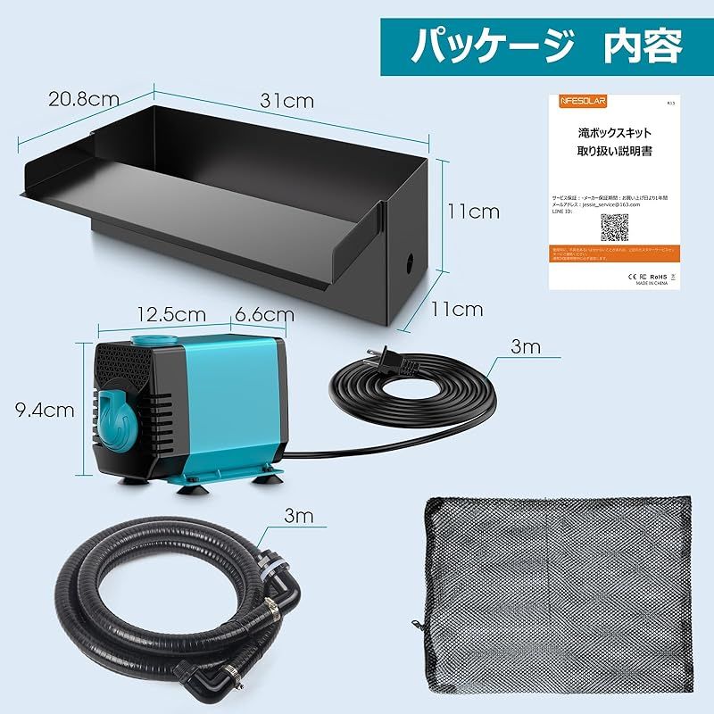 商品名:NFESOLAR 池用滝ボックス ポンプキット付き 304ステンレススチール 池用滝排水路 40W 660GPHポンプ付き 池用 3メートル波形チューブ付き 池排水路 ガーデン滝用 (30cm)