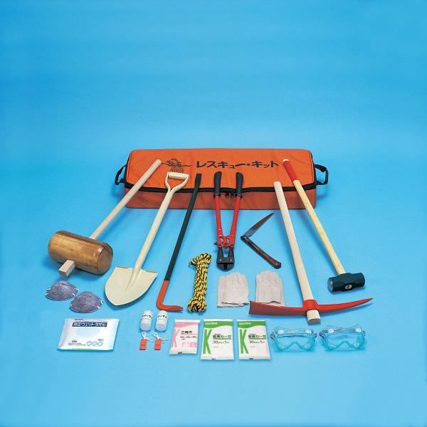 平バール(900mm)、ボルトカッター(600mm)、折込みのこぎり(刃渡り210mm)、大ハンマー(両口3.5kg)、丸カケヤ(直径150mm)、バチヅル(1.8kg)、ショベル(丸型935mm)、誘導用ロープ(10m)、牛革手袋(×2)、ゴーグル(×2)、防塵マスク(×2)、ホイッスル(×2)、三角巾(×1)、ガーゼ(×2)、包帯(×2)、ウェットタオル(20枚入)
